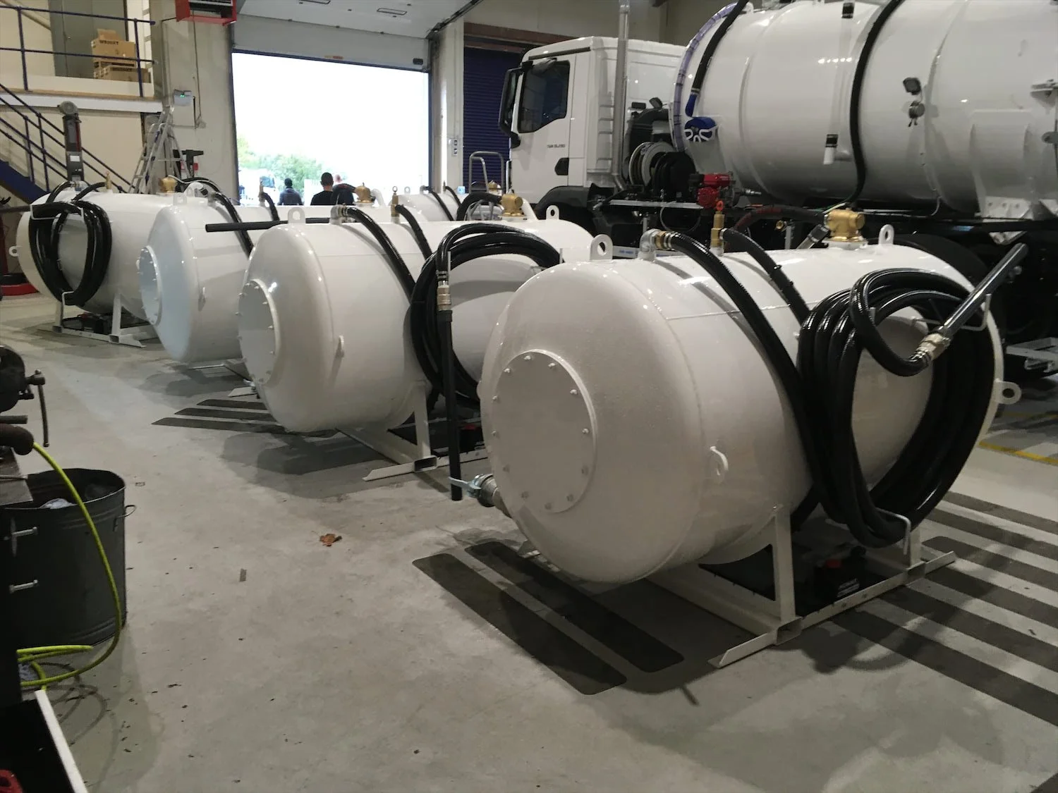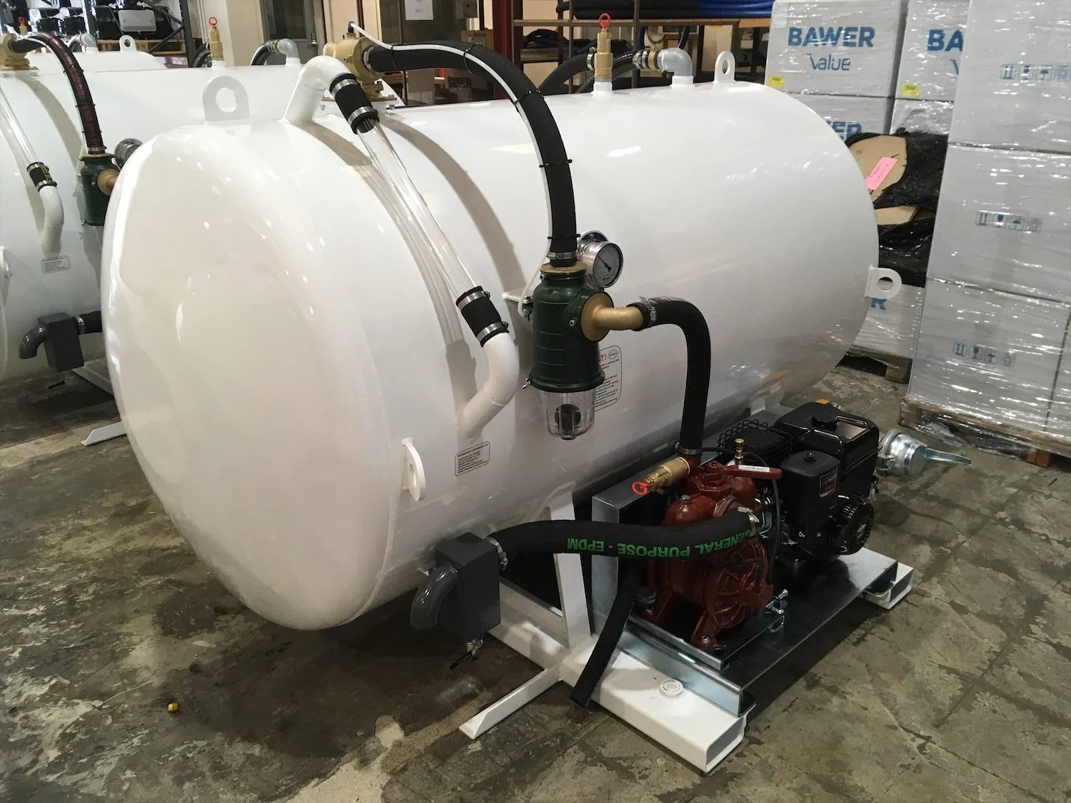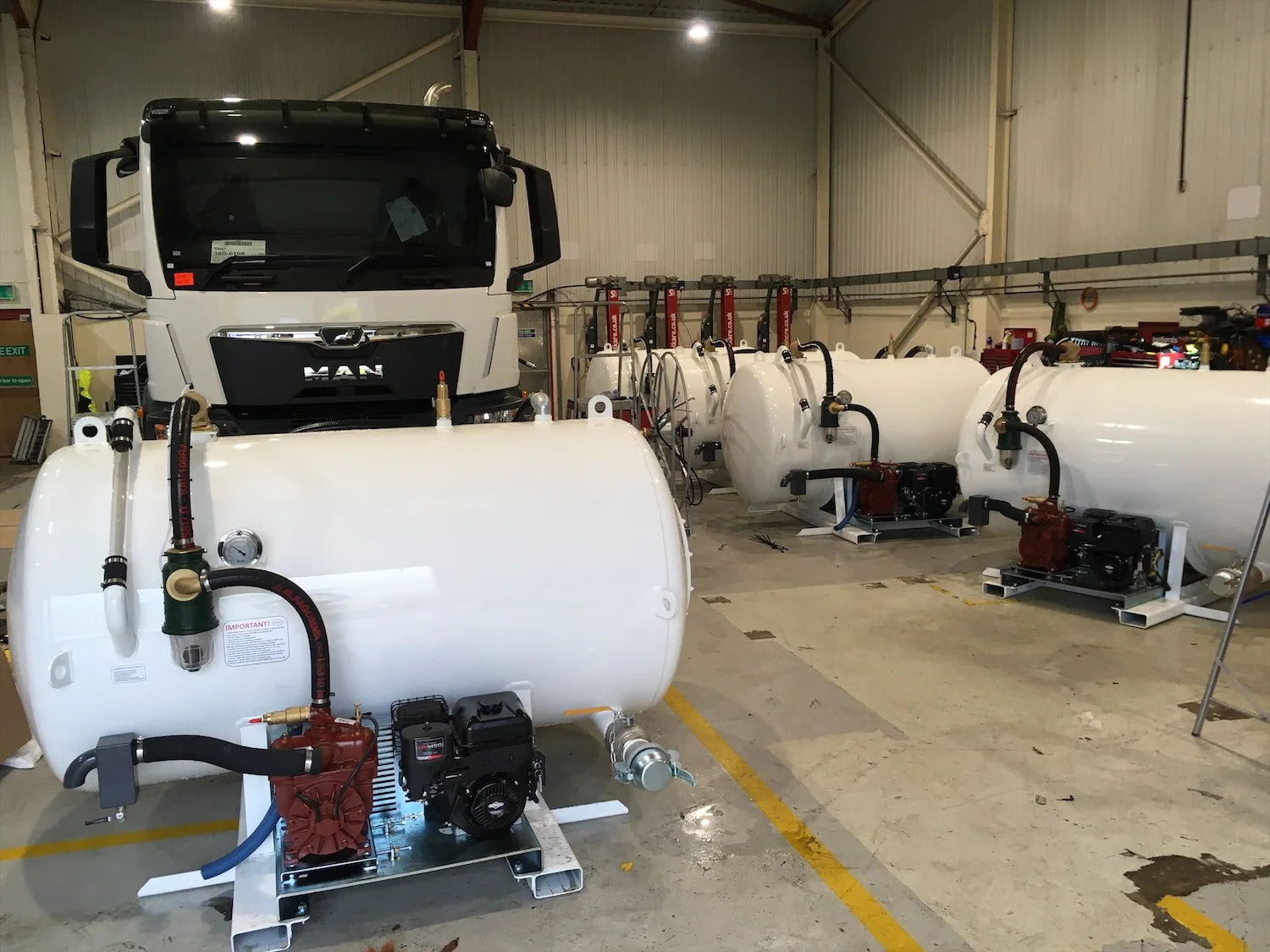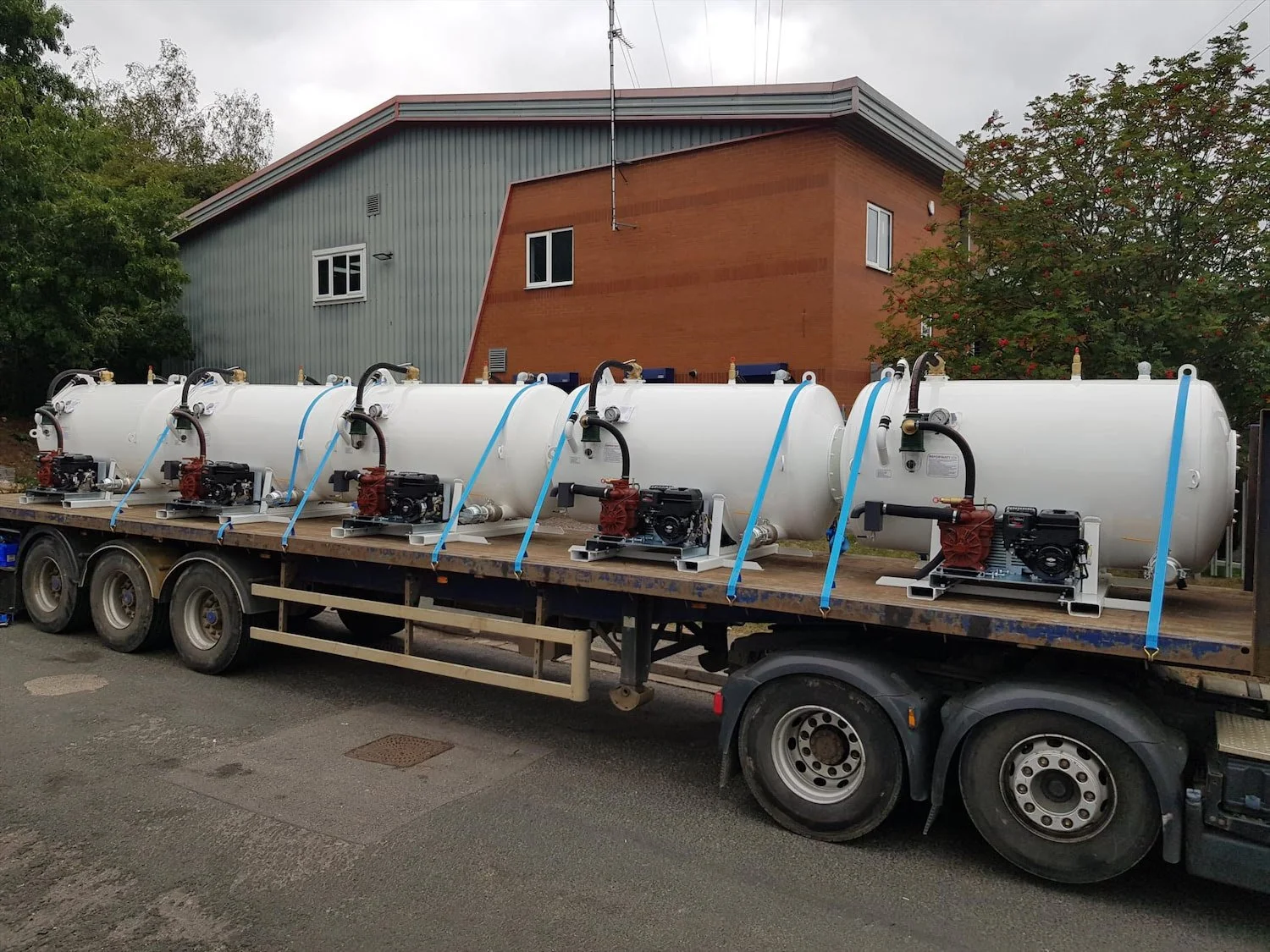 Supplied in three batches of five at a time, these 550 gallon or 2,500 litre capacity ‘single’ compartment demountable Buckaloos were of the usual robust mini vacuum tanker construction, including forklift slots and lashing/lifting eyes, electric start Briggs petrol engine driving the exhauster pump with oil collection device, also 50’ x Supervin suction hose on stays with probe and 2” valve, 4” outlet ball valve and the usual twin cut-out protection assemblies, twin relief valves, sight tube and gauge, all finish painted white in this instance.